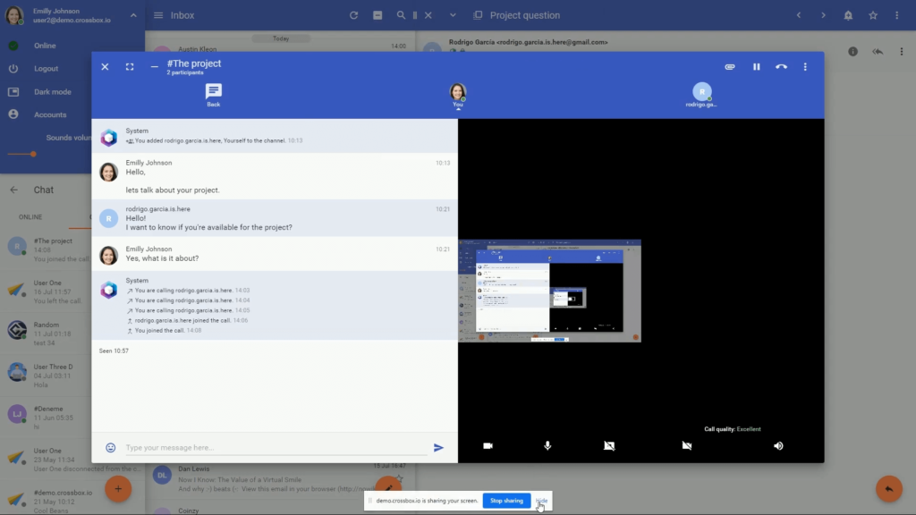 Avvia chat, chiamate audio o video di alta qualità direttamente dalla tua casella di posta.