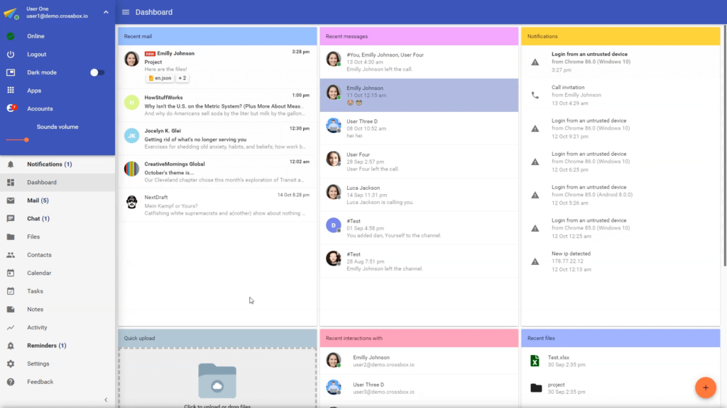 Una dashboard centralizzata per avere una panoramica di tutte le comunicazioni: email, canali, file e notifiche.
