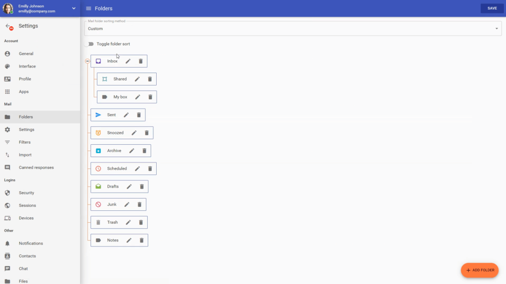 Crea strutture di cartelle email semplici o nidificate, assegnando a ciascuna un’icona e un colore distintivi.